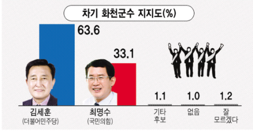 강원일보가 여론조사 전문기관 (주)에이스리서치에 의뢰해 지난 17~18일 화천군에 거주하는 만 18세 이상 남녀 502명에게 화천군수 후보자에 대한 지지도를 물은 결과(95% 신뢰수준에 표본오차 ±4.4%포인트) 더불어민주당 김세훈 후보가 63.6%로 국민의힘 최명수 후보(33.1%)를 앞섰다. 두 후보 간 격차는 30.5%포인트다.