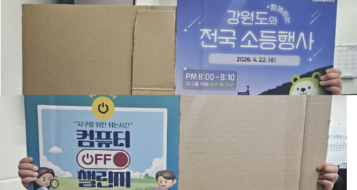 강원자치도는 20일 여중협 강원지사 권한대행 주재 기자간담회에서 ‘강원도와 함께하는 전국 소등행사’, ‘지구를 위해 쉬는 시간…컴퓨터 OFF챌린지’ 2가지 버전의 판넬을 선보였다. 도는 그동안 브리핑 및 기자간담회에 플라스틱 또는 스티로폼 재질의 판넬을 제작, 활용했으나 이날 판넬은 특별한 의미를 지녔다. 직원들이 폐지함에서 수거한 종이박스를 활용해 제작했기 때문이다.
