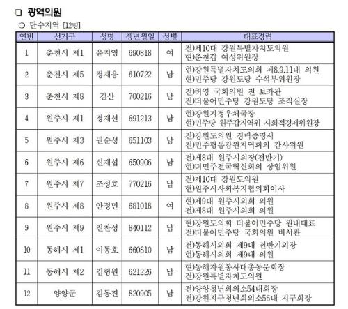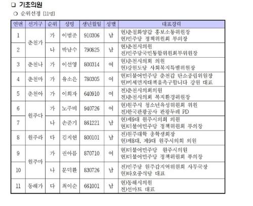 이에 따라 광역의원 춘천 1선거구 윤지영, 5선거구 정재웅 후보가, 새롭게 신설된 8선거구에는 김산 후보가 단수 공천을 받았다. 춘천 2선거구는 이교선·이혜영 △춘천3 김양욱·원태경 △춘천4 이승진·황관중 후보가 경선을 치른다.