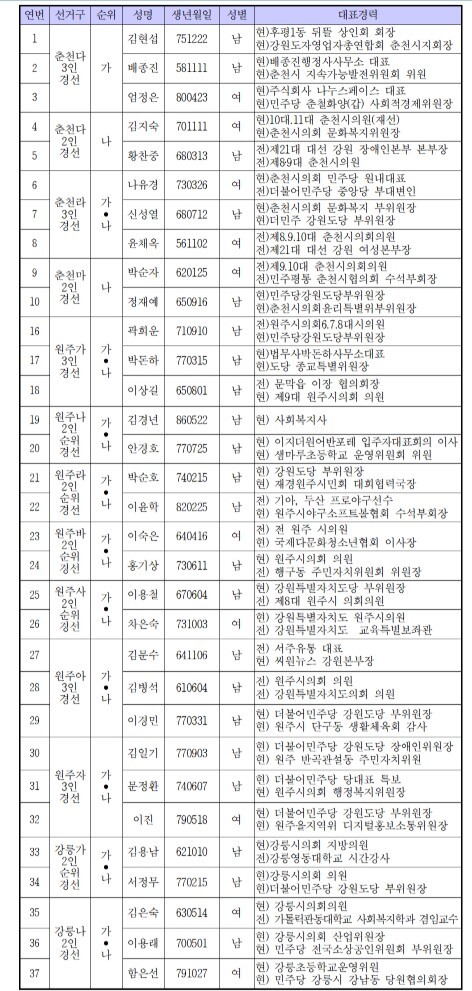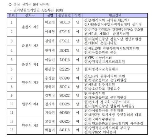 이와 함께 22~23일 춘천 강릉 동해 태백 삼척 속초 정선 고성 홍천 평창 화천 양구 기초 비례대표 후보자 선출을 위한 경선을 실시, 24일 발표할 예정이다.
