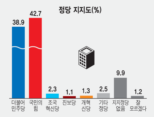 정당 지지율 역시 팽팽했다. 민주당 38.9%, 국민의힘 42.7%로 오차범위 이내다.