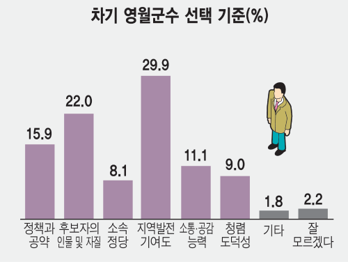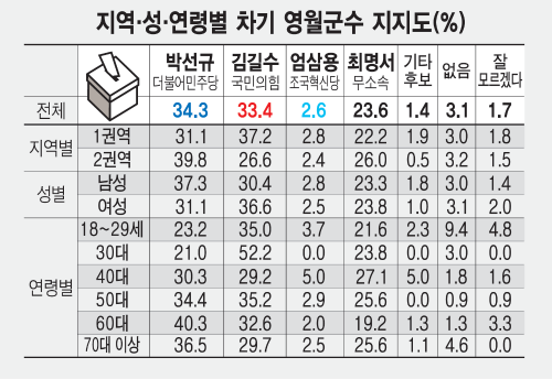정당 지지도도 양당에 분산⋯후보 지지도 40대 이상 혼전 양상=후보 지지도를 연령별로 보면 40대에서는 박선규 후보 30.3%, 김길수 후보 29.2%, 최명서 후보 27.1%로 모두 오차범위 내에서 표심이 분산됐다.  40대 이상에서는 박 후보와 김 후보 지지도가 모두 오차범위 내에서 혼전 양상이었다. 김 후보는 18~29세(35%), 30대(52.2%)에서 높은 지지를 얻었다. 엄삼용 후보는 40대에서 5%로 가장 높은 지지를 얻었다. 권역별로는 1권역(영월읍, 상동읍, 산솔면, 김삿갓면)에서 김 후보가 37.2%, 박 후보가 31.1%를 얻었고, 2권역(북면, 남면, 한반도면, 주천면, 무릉도원면)에서 박 후보가 39.8%로 26.6%인 김 후보를 앞섰다. 최명서 후보는 2권역에서 26%의 지지를 얻으며 김 후보와 0.6%포인트 격차가 났다.  1권역 지역구 도의원이었던 김 후보 입장에서는 2권역을 어떻게 공략하느냐를 과제로 안게 됐다.