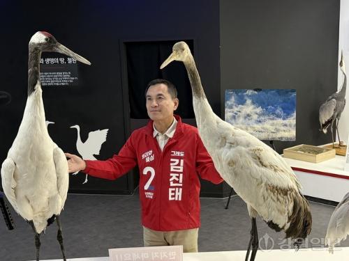 ◇국민의힘 김진태 강원지사 후보는 23일 철원‘DMZ 두루미평화타운’을 방문, 철새를 활용한 생태 관광 비전을 제시했다. 김대호기자
