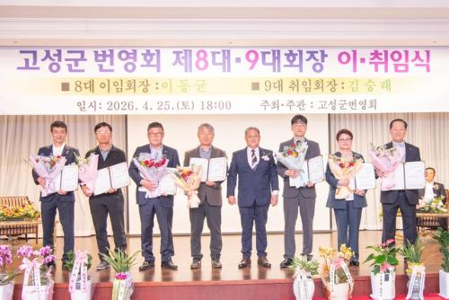 고성군번영회 제8·9대회장 이·취임식이 지난 25일 파인리즈리조트에서 전철수 고성군수 권한대행과 용광열 고성군의장, 이양수 국회의원, 김용복 강원특별자치도의회 부의장, 정준화 강원특별자치도 번영회연합회장 등 200여명이 참석한 가운데 열려 제8대 이동균 회장이 이임하고 제9대 김승래 회장이 취임했다.