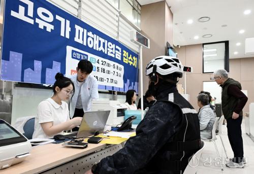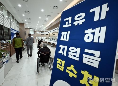 고유가 피해지원금 1차 지급 첫날인 27일 춘천시 강남동행정복지센터에서 시민들이 지원금을 신청하기 위해 대기하고 있다.