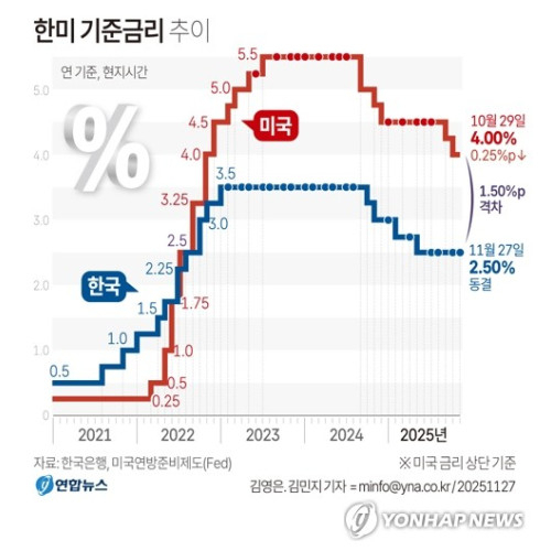 2025-11-27 [21:42:36]한은 기준금리 2.5%로 4연속 동결…내년 경제성장률 전망치 1.6→1.8% 상향 조정