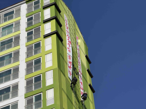 원주 아파트 외벽서 근로자 2명 고공 시위…2시간 만에 내려와
