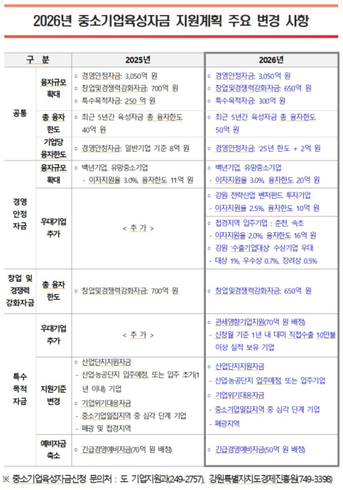2026-01-07 [00:00:00]기업별 융자 한도 50억원으로 확대…경영안정자금 10억원으로 상향