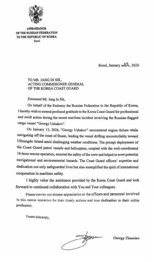 2026-01-23 [00:05:00]‘국적 불문’ 16시간 필사 대응…동해해경청 헌신에 주한 러시아 대사관 “깊은 감사”