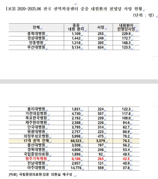 전국 권역외상센터별 전원율·사망률 격차 심각…원주기독병원 5년간 263명 숨져